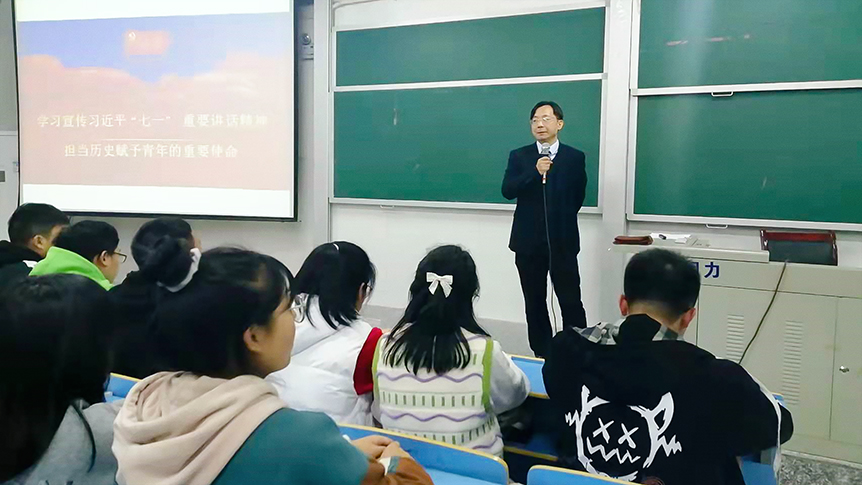 11月10日晚,党委委员、纪委书记李学勇教授在明德楼南栋T4多媒体教室,以“学习宣传习近平‘七一’重要讲话精神 担当历史赋予青年的重要使命”为主题,给理学院(师范学院)师生上了一堂生动深刻、内容丰富的形势与政策课。此次形势与政策课由院党总支书记刘水凤主持。