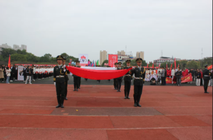 入场式完毕后,紧接着进行了升旗仪式,全场肃立,奏唱中华人民共和国国歌。雄壮的国歌声在体育场上空回荡,激荡着每一位师生的爱国之心。