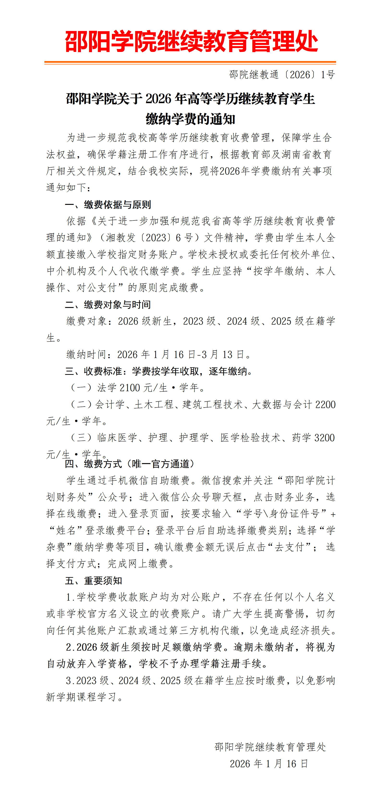 邵阳学院关于2026年高等学历继续教育学生缴纳学费的通知