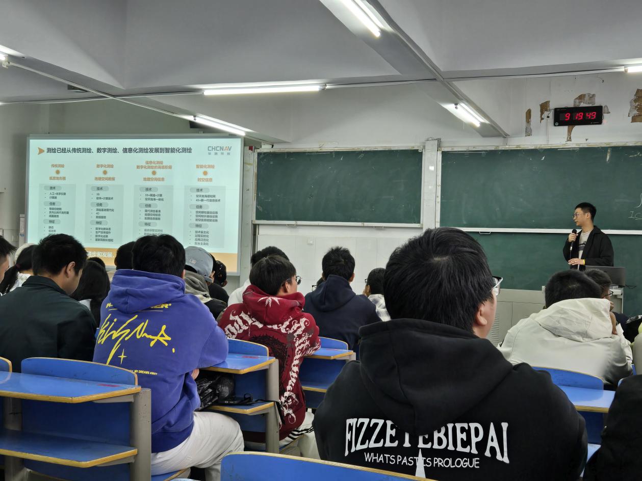 学术讲座在明德楼T2教室举行,华测导航湖南公司教育事业部负责人李昊霖作题为“智能测绘进校园,助力教学实训转型升级”的专题报告。作为国内领先的卫星导航企业,华测导航系统展示了智能测绘装备的最新成果,重点介绍了其高精度、高效率及“空天地海一体化”作业模式的显著优势。团队还借助无人机与先进点云技术,在会前生成了校园电气实训楼、机械实训楼等建筑的三维立体景观,并在现场进行了展示。通过多行业、多场景的测绘应用案例,师生们深入了解到智能测量技术在国土、建筑、交通、水利、农林、电力等领域的广泛应用,切身感受到智能装备为传统测绘行业带来的数字化与智能化变革。
