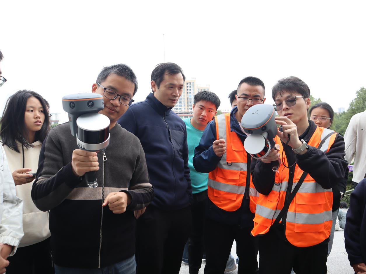 在明德楼北楼广场,手持SLAM扫描仪的建筑扫描演示引发师生浓厚兴趣。技术人员现场指导师生操作RS10/RS30两款移动测量激光扫描仪,实时完成北楼室内立面数据采集与快速三维建模,展现了该技术在建筑智能监测、建筑遗产数字化保护等场景的应用价值,生动诠释了“数智赋能建筑焕新”的行业理念。