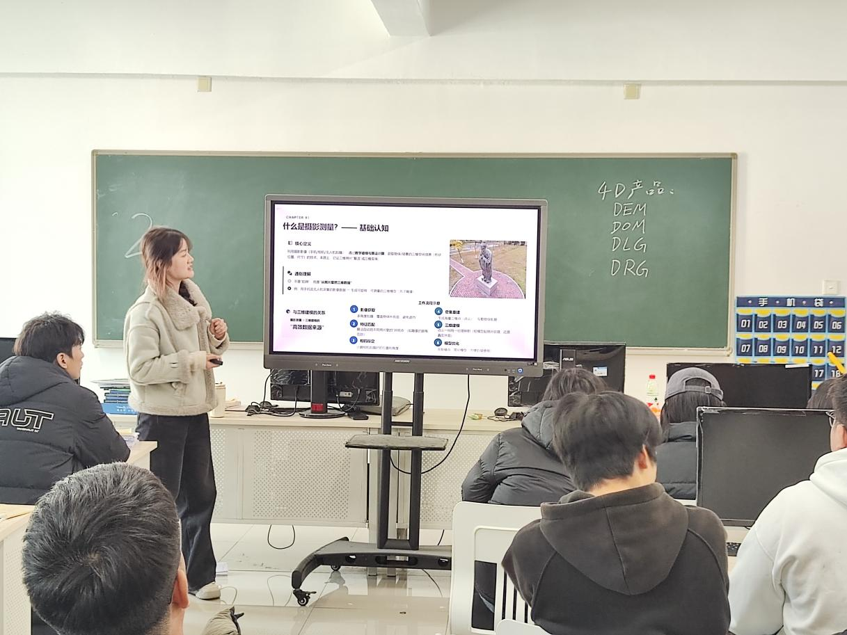 时间:2026-01-062026年1月6日,测绘工程专业的《摄影测量与遥感(实景三维建模)实习》课程开展了一次特殊的教学实践。2021届毕业生袁思颖校友返回母校,为在校生演示了实景三维的场景建模与渲染全过程,带来了一堂生动直观的专业实践课。