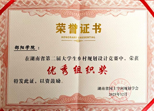时间:2026-01-13近日,湖南省第二届大学生乡村规划设计竞赛结果正式揭晓。在全省14所高校、89支参赛团队的激烈竞争中,土木与建筑工程学院城乡规划专业学子凭借扎实的专业功底、创新的设计理念与务实的实践精神,斩获各类奖项7项(其中二等奖3项、佳作奖4项),邵阳学院荣膺“优秀组织奖”,充分彰显了土木与建筑工程学院城乡规划学科的教学实力与人才培养成效!