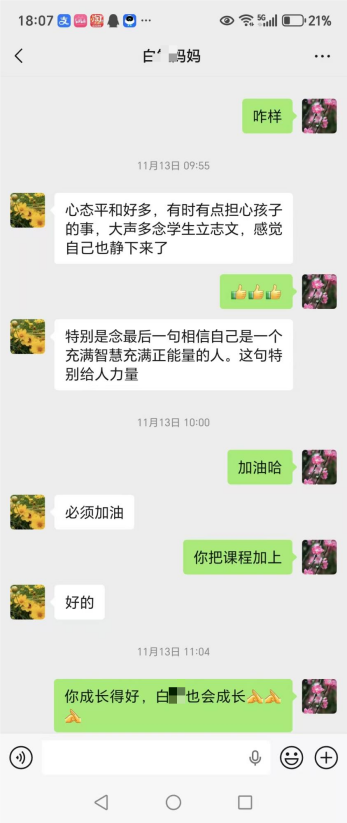 为引导学生成长,蔡玉梅老师专门约谈该生,在充分且认真的交谈后,该生深受启发,达成了思想上的觉醒与认知进阶。 |