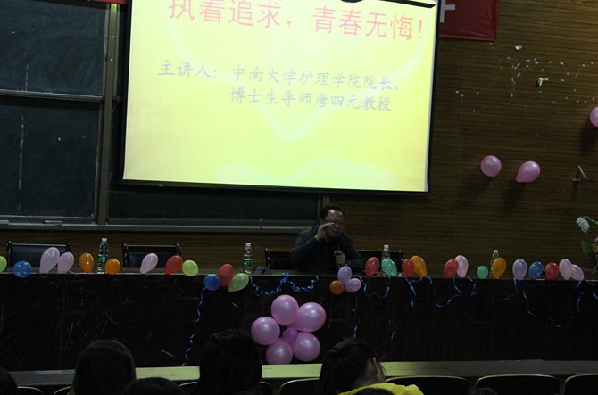 晚上7:30,唐四元院长应邀为我校护理系新生作题为“执着追求,青春无悔”的励志讲座,护理系500余名师生认真聆听了此次讲座。唐院长结合自己坎坷的人生经历和求学历程,向在场师生阐述了人为什么要励志,应该怎样励志,以及如何充实地度过自己的大学生活三个方面的问题。他说:“同学们不要因为自己是个专科生而感到悲观,现在的起点不代表将来的终点。人应该活到老,学到老。大学是人生最宝贵的几年,也是人的精力最集中的几年,激情飞扬的大学生们,你们应该珍惜时间,努力充实和提升自己,将来在回忆往事的时候,才能真正做到青春无悔!”唐院长的语言生动风趣,通俗易懂,精彩的讲座赢得了现场阵阵热烈掌声,其坚韧不拔、执着追求的求知精神也使在场师生倍受鼓舞、受益匪浅。