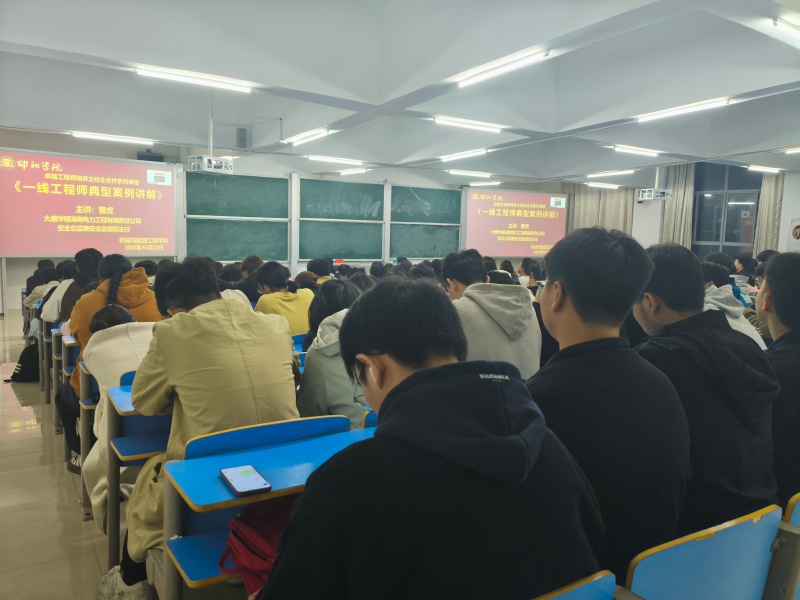 2025年10月23日晚上,我院在明德楼举办“卓越工程师培养计划”校企合作课程 “一线工程师典型案例教学”。特邀大唐华银湖南电力工程有限责任公司安全总监兼安全监督部主任曹虎为主讲嘉宾,机械与能源工程学院副院长郭文敏主持,2022级能源与动力工程专业全体学生、2025级能源与动力工程专业学生代表聆听本次讲座。