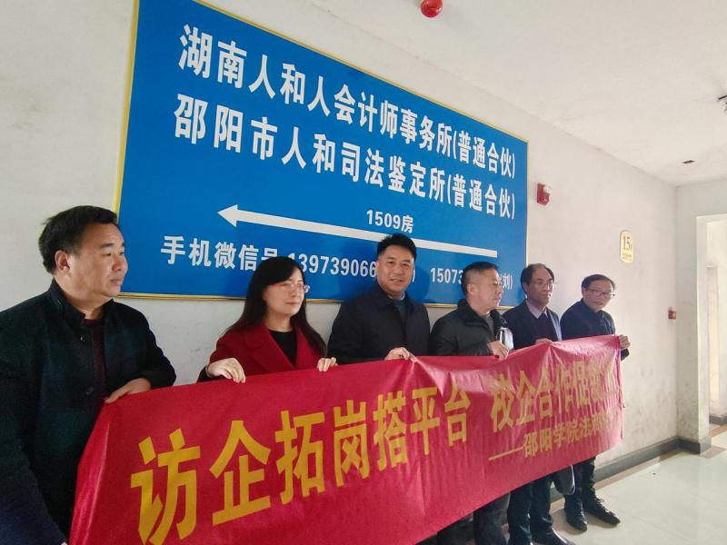 为积极响应党中央、国务院“稳就业”“保就业”决策部署,扎实推进“访企拓岗搭平台,校企合作促就业”行动,有效促进我院毕业生顺利就业,2024年3月10日,邵阳学院法商学院张先友书记和郑爱民院长带队进行了访企拓岗活动,蒋敏副书记、王周火副院长、就业专干唐杰以及专业教师刘健喜陪同走访,走访了湖南人和人会计事务所、邵阳市人和司法鉴定所,并于事务所签定了邵阳学院大学生就业基地建设协议书。
