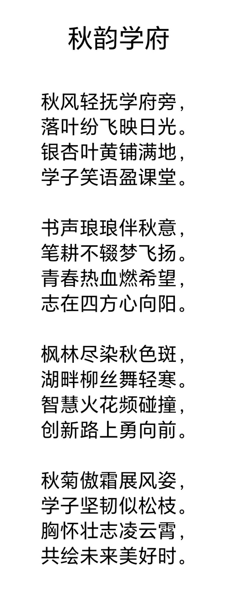 本次活动时间是2024年10月30日到11月6日,在这八日内,参与者以“秋”为主题进行原创诗词创作,以诗词为载体,将秋季之美与诗词文化相结合,纷纷提笔留下自己对秋的感悟与喜爱,并将它们融入诗词之中,越来越多的优秀诗词在活动中涌现。同学们为本此活动付出心血,在提笔落笔之间感受到中华传统文化的魅力,提升文学素养,培养综合素质。校园也因此充满了浓郁的文化氛围,充分展现出诗词之美。