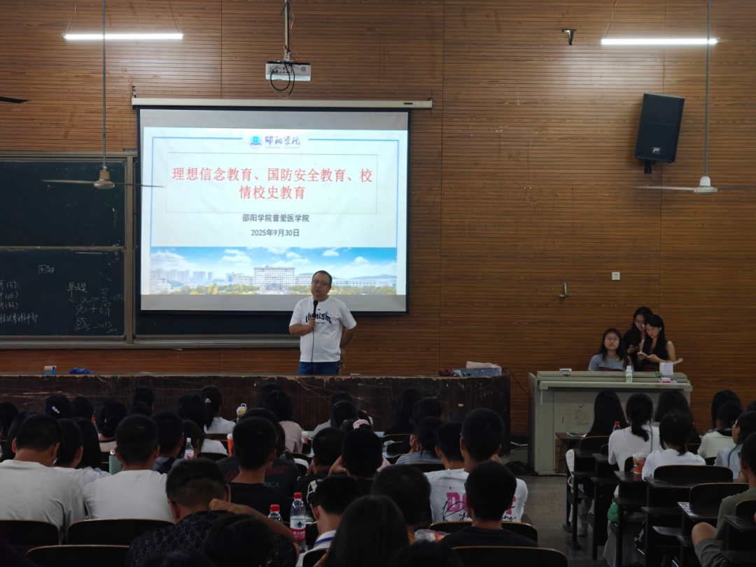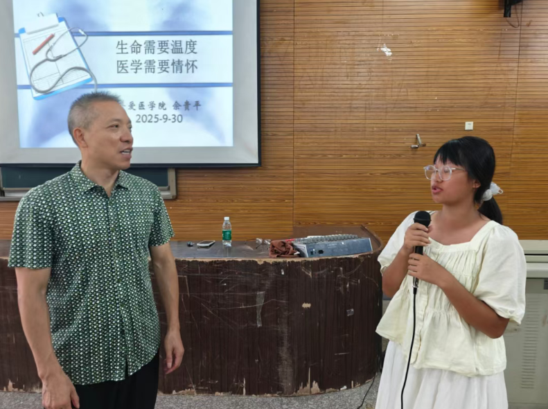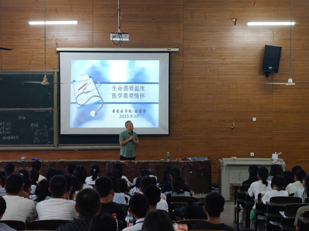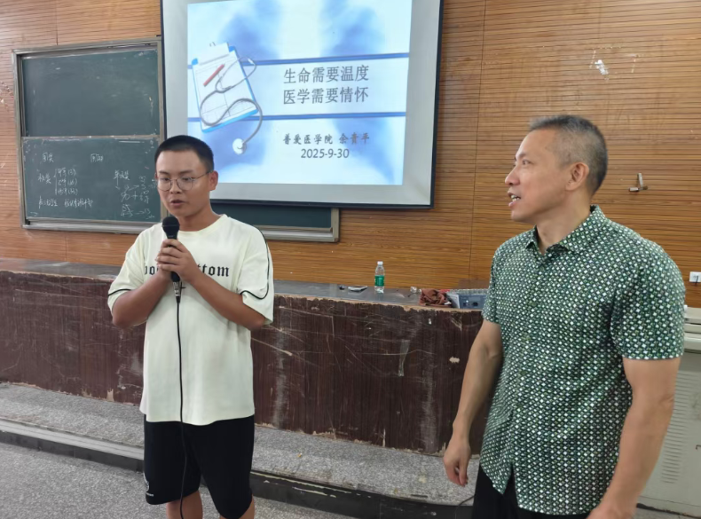 9月30日上午9时,普爱医学院副院长佘贵平院长为2025级新生开展题为“生命需要温度,医学需要情怀”的临床医学专业认知教育,为大家深度解读本专业的学习目标,学习课程和所必需的医学人文关怀。