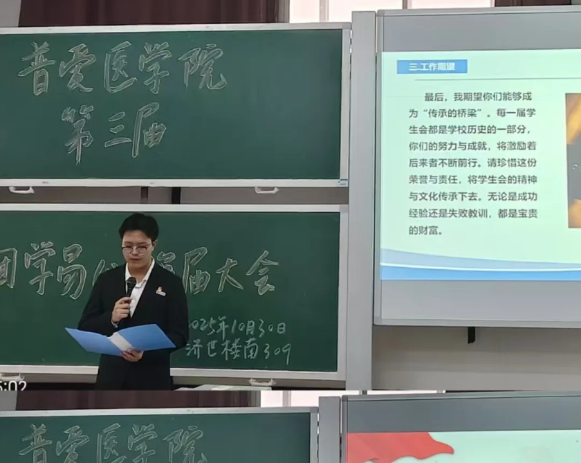 随后,普爱医学院第三届团总支委员会、学生联合会主席团竞选演讲环节正式开启。八位来自团学组织的干部候选人依次登台,通过回顾过往工作成就、阐述未来规划与服务理念展开角逐。竞选结束后,全体人员进行投票,现场公布并宣读新一届团学干部名单。最后,院领导及老师为上一届团学干部颁发工作聘书,表彰其过去一年的辛勤付出与突出贡献,激励新一届团学干部接续奋进。