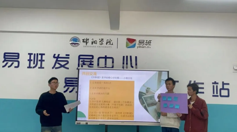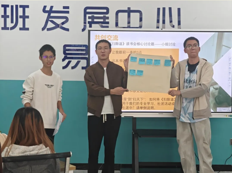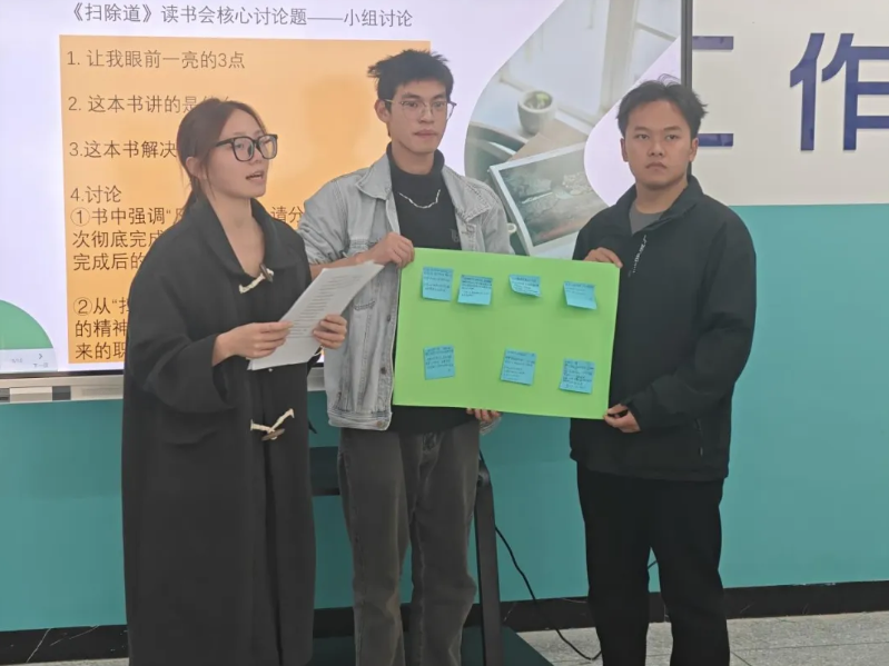 活动现场遵循 “破冰 — 共读 — 分享 — 共创” 的完整流程,氛围热烈而有序。破冰环节围绕 “卫生相关的感动或尴尬事件” 展开,一位同学分享了校领导检查前,和舍友用整个晚自习清理寝室里往届遗留的旧衣物等杂物的经历,分工合作后宿舍明显变宽敞,“原本以为只是应付检查的打扫,最后却成了和舍友增进默契的机会,看着干净的房间,连学习时都觉得心定了”。片段阅读阶段,大家领取专属章节角色卡,化身 “章节专家”,在 15 分钟沉浸式阅读中划线批注、记录感悟。分享交流环节,“专家们” 逐一登台,结合书中案例与自身经历解读核心观点,从 “日本美好协会” 的诞生故事到海外实践案例,让抽象的 “扫除精神” 变得具体可感。