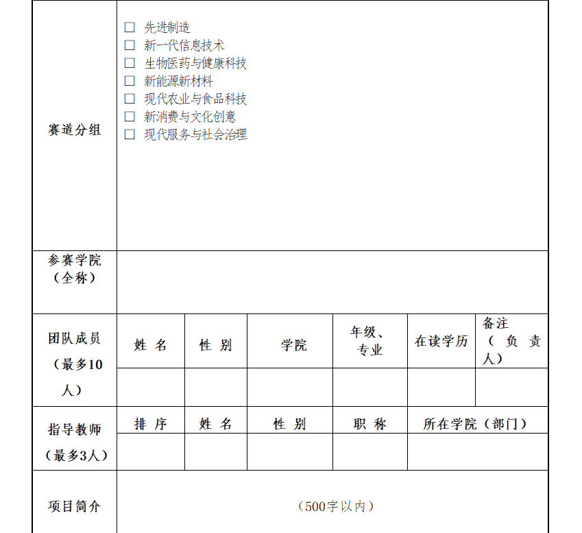 1.参赛项目根据比赛相应的要求,选择符合要求的组别,每个参赛项目只可选择参加1个组别,不得兼报。以项目团队形式参赛,每个团队原则上不不超过15人,指导教师原则上不超过5人,竞赛报名截止后,不可进行人员添加、顺序调整操作,只可进行人员删减。