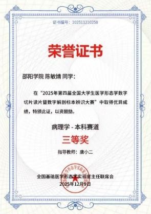 近日,第四届高等医学院校大学生数字形态学读片和数字解剖标本辨识技能大赛全国决赛圆满落幕。在本届大赛中,全国共有220余所院校近1.7万名学生同台竞技。我校参赛学子凭借扎实的专业功底、出色的实践能力与稳定的临场发挥脱颖而出,一举斩获一等奖 1 项、二等奖 3 项、三等奖 5 项,学校荣获 “优秀组织奖”。其中,普爱医学院临床医学专业学生黎梦颖(指导教师:夏宇)在竞争激烈的人体解剖学赛道表现优异,成功入围全国线下总决赛(全国本科组仅25人),充分展现了我校医学人才培养的扎实成效与过硬质量。