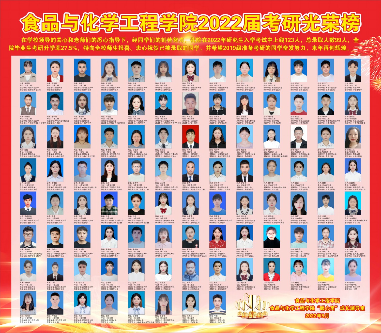 2022年全国硕士研究生招生录取及网上调剂工作结束,食品与化学工程学院2022届毕业生共有360人。据统计,学院考研上线人数123人,99人通过复试被录取,全院毕业生考研升学率达27.5%。其中18级食品科学与工程专业4栋2单元6022女生宿舍6人,5人选择考研全部考上,分别被湖南师范大学、西南大学、贵州医科大学、曼彻斯特大学录取。