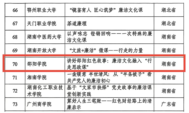 近日,教育部办公厅正式公布第十届高校廉洁教育系列活动评选结果,我校马克思主义学院打造的《讲好邵阳红色故事:廉洁文化融入“行走思政课”》作品,成功入选本届活动“树廉风”廉洁文化课优秀作品,这是我校在廉洁文化建设与思政教育融合工作中取得的重要突破性成果。