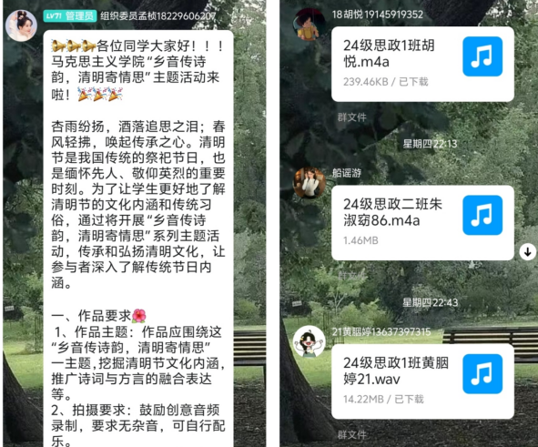 活动过程中,参赛者们踊跃参与,进行创意音频录制,来自不同地域的乡音,或软糯、或豪爽,让诗词有了别样韵味。《清明》《寒食》等诗词在乡音的演绎下,唤起大家对先人的缅怀和对传统文化的热爱。最后,在工作人员及同学们的共同努力下,“乡音传