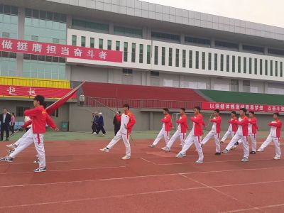操场上师生们已经列队站定,耳边也逐渐传来铿锵划一的脚步声,是仪仗队迈着掷地有声的正步护送国旗走向升旗台,他们的每一步都透着坚定,尽显体育学子的昂扬风貌,伴随着庄严的《义勇军进行曲》,五星红旗冉冉升起,鲜艳的旗帜在晨光中舒展飘扬,全体人员肃立行注目礼,神情庄重。