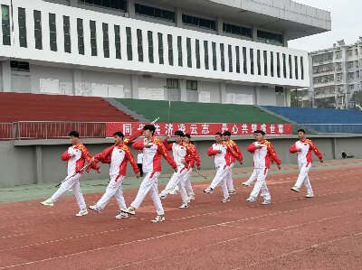 此时耳边渐渐传来整齐划一的脚步声,仪仗队迈着正步走来,肩扛国旗,步伐铿锵有力。正一步一步朝着升旗台走去,每一步都彰显着体育学院学子们意气风发的精神面貌。伴随着《义勇军进行曲》的响起,五星红旗也缓缓升起,全体师生肃立,面对着国旗行注目礼,鲜红的底色在灰白天空下格外耀眼。