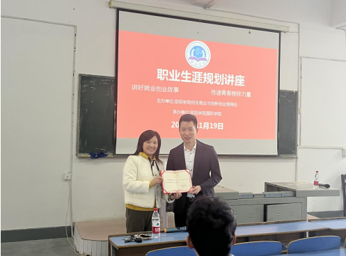 活动最后由刘丽华院长代表学院各领导老师向张伟先生颁发邵阳学院国际学院职业规划导师的聘书,并于崇德楼前进行合影留恋。
