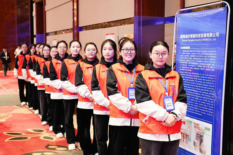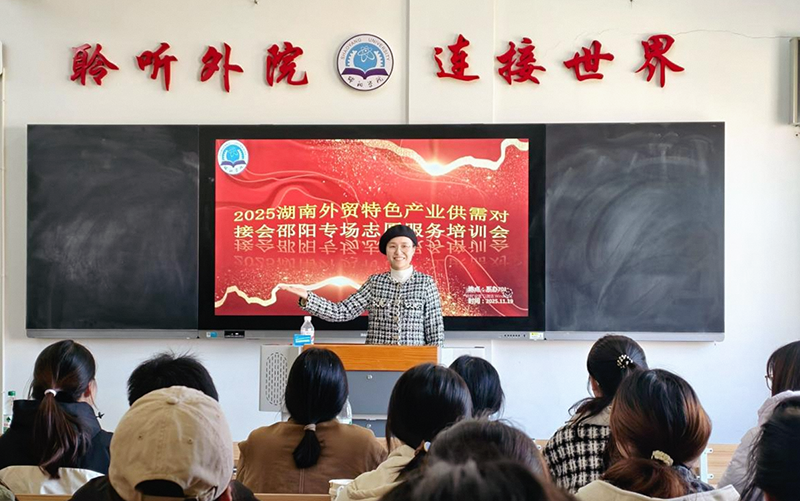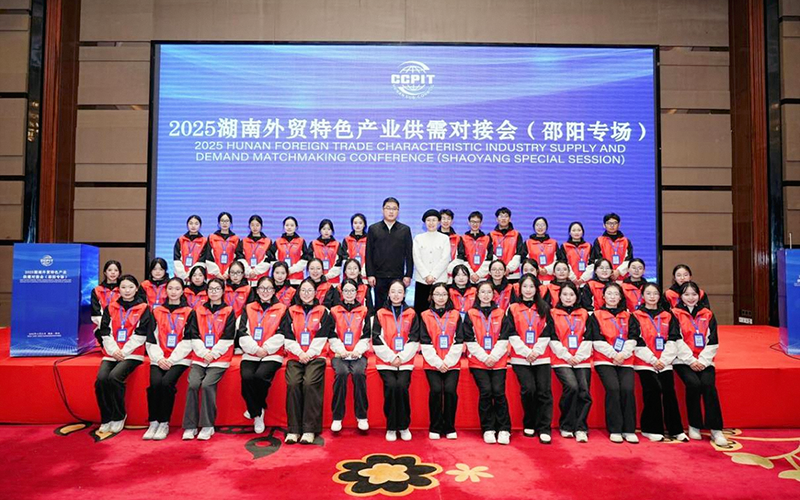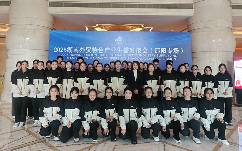 1121日,2025湖南外贸特色产业供需对接会(邵阳专场)在邵阳湘林温德姆至尊豪庭大酒店成功举办。我校外国语学院党总支积极发挥“双融双促,‘语’我精彩”党建品牌引领作用,组织由教工一支部党员李林钰副教授带队、40名学生组成的志愿服务团队,全程参与会议服务,为中外企业对接提供专业语言支持。