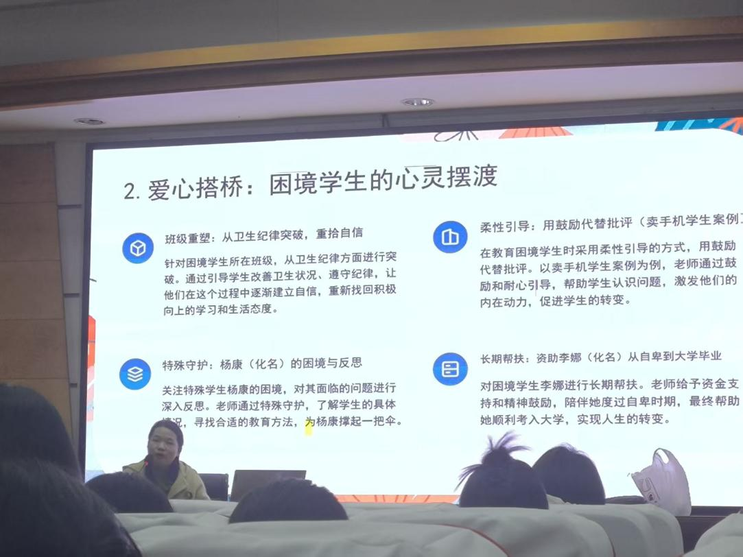 邓雪老师围绕“初心缘起”“育人实践”“教育感悟”“寄语未来”四个板块展开分享。在“育人实践”环节,她重点介绍了针对困境学生的“爱心搭桥”策略:从班级卫生纪律入手帮助学生重建自信,以“鼓励代替批评”的柔性引导化解学生行为问题,还通过长期资助与精神陪伴,助力自卑学生顺利考入大学。这些真实案例,让大家深刻感受到教育的温度与力量。此外,邓雪老师创新提出“班名赋能”理念:将班级命名为“微笑365”“星火427”“鲲鹏2309”等,以班名承载精神引领——“微笑365”鼓励学生以乐观驱散迷茫,“星火427”倡导聚沙成塔的团队精神,“鲲鹏2309”激励学生志存高远。这种以文化符号浸润成长的方式,为班级管理提供了新思路。