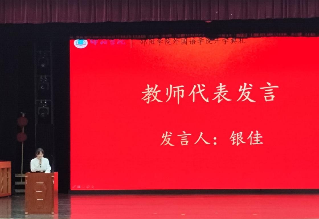 新生代表、2025级英语三班陈润萌同学满怀热忱地走上讲台。她以真挚的话语分享对大学生活的憧憬,郑重表达将在外国语学院深耕专业、追逐梦想,以青春之力为学院增光、为祖国贡献的坚定决心,尽显新一代外院学子的朝气与担当。
