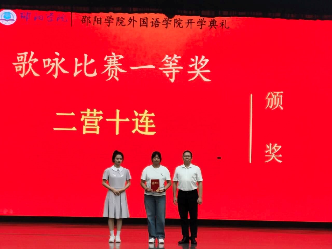 在全场期待的目光中,颁奖典礼庄重启幕。2025级新生军训期间,涌现出一批表现卓越的集体与个人:默默奉献、搭建沟通桥梁的“优秀代理班主任”;意志坚韧、彰显外院风采的“军训优秀学员”;以及用嘹亮歌声唱响团结、以昂扬旋律展现青春的“歌咏比赛冠军与优秀连队”。院领导与老师为获奖代表颁发荣誉证书。每一张证书,不仅凝聚着汗水与拼搏,更象征着一种可学的典范、一股催人奋进的力量。