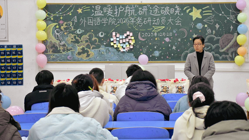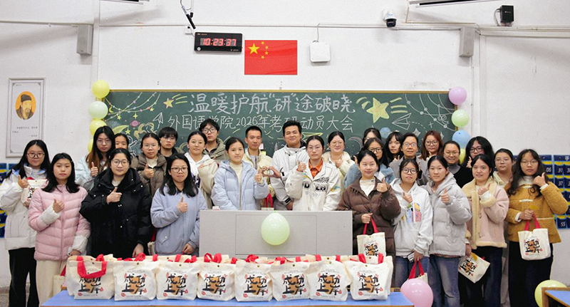 12月12日,外国语学院在李子园校区举办2026届考研学生动员会,并现场发放精心准备的“考研加油包”,为正在冲刺备考的学子送去关怀与鼓励。学院党总支副书记夏琳钦、2022级辅导员胡瑶及全体考研学生参加活动。