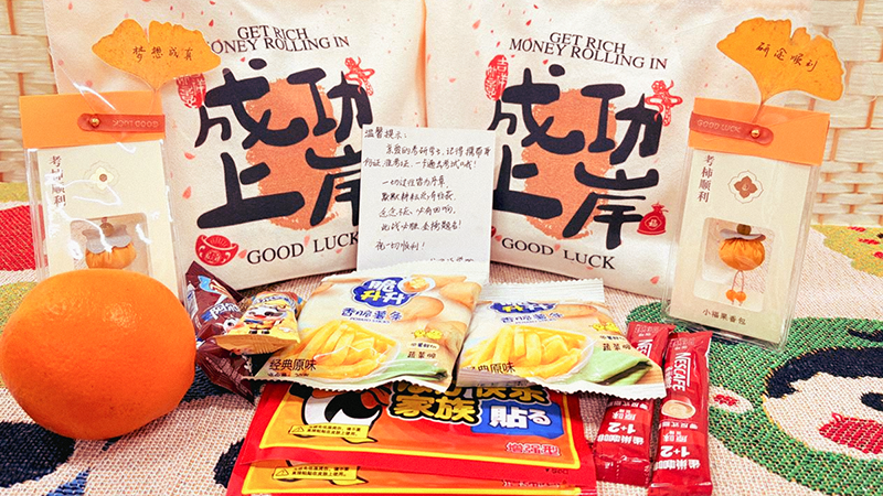 动员会上,老师们向备考学生逐一发放了寓意美好的加油包。每份礼包内包含手写祝福卡、脐橙、咖啡、零食、柿子挂件、棒棒糖、暖贴及手写过塑银杏叶等八样物品,分别寓意“成功”“续航”“思路清晰”“事事顺利”等美好祝愿,以实用且温馨的方式为学子加油鼓劲。