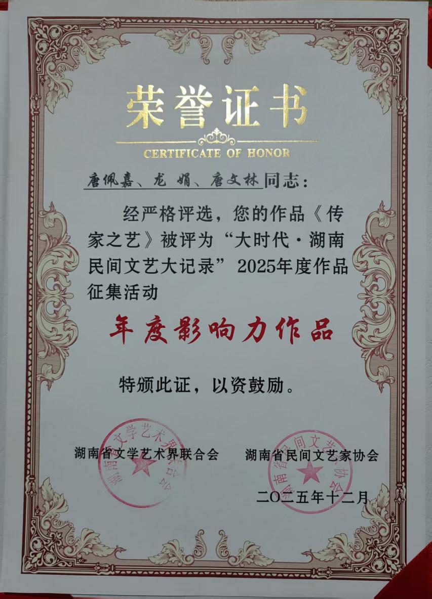 2026年2月10日,在湖南省文联、省民协主办的“大时代·湖南民间文艺大记录”评选中,邵阳籍青年剪辑师唐佩嘉与妻子龙娟共同创作的纪录片《传家之艺》荣获“年度影响力作品”奖。作为邵阳学院外国语学院二支部的党员教师、宝庆烙画传承人,龙娟表示,这份荣誉既是鼓励,更是一份沉甸甸的责任。