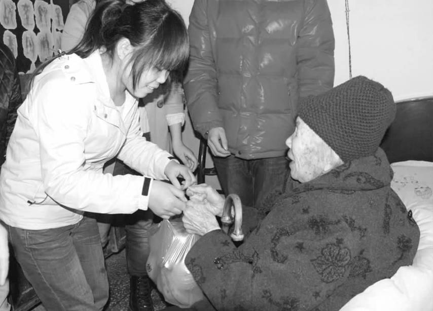 图为志愿者在看望一位90多岁老人