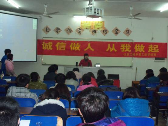 为了弘扬大学生诚信精神,信息工程系学生会勤工助学部于2012年3月7日在教学楼A502举办了以“诚信做人,从我做起”为主题的活动,本次活动成员主要是信息工程系09级,10级,11级三个年级的贷款学生,共有60余人参加。当晚19点整,随着主持人慷慨激昂的开场白,活动正式拉开了序幕。活动内容有诚信知识竞答,诚信教育视频播放以及诚信联合签名等多个趣味横生又具有教育意义的环节。其中知识竞答活动让大家在紧张的气氛中收获到了更多诚信的知识;相声小品环节让大家在欢乐声中明白诚信在生活中的重要性;陈敏老师的讲话更是让大家对于贷款方面的知识有了更深刻的认识。最后的诚信签名环节把此次活动推向了高潮,所有成员都踊跃签名,气氛非常活跃!通过此次的活动,我们都有了收获,明白了诚信的意义及重要性,更提高了诚信在大家心中的地位,坚定了维护诚信,按时还贷的信念。最后随着主持人宣布活动结束,该活动取得了圆满成功!我们相信通过此次活动,广大学生对于诚信会有更深的见解,为以后能做一个诚信的人,成功的人而不断努力!