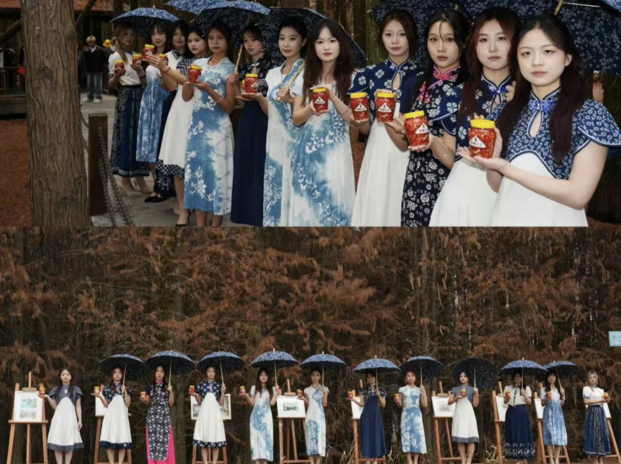 活动中,同学们巧妙融合艺术表演与乡土文化:T台秀环节,模特身着国家级非遗蓝印花布服饰,手持邵阳特色农产品“农家三辣”, 展现乡村特色与时尚的创意结合;快板说唱生动讲述云水村故事,吉他弹唱与街舞表演点燃现场气氛。摄影团队全程记录,为乡村文旅宣传积累了大量优质素材。
