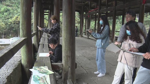 2019级学生景鹏飞说:“在绥宁县关峡苗族乡的写生活动,使我们的绘画技艺得到质的提高,加深了我们对民族艺术的热爱,也让我们认识到了风土人情与水彩之间存在的千丝万缕的联系,希望用我们的力量将这里,将这些有着千年文化的名村描绘下来,分享出去!”李娴说她一来到绥宁就被这里的生态美景所陶醉,短短数天时间她共创作了10幅苗乡美景图。学院基础教研室主任、教授聂世忠,每年都要到绥宁采风写生,创作了不少反映绥宁生态美景的作品,深受业界好评。这次他带领学生到关峡苗族乡定远桥写生,立即被周边的美景所吸引。他兴奋地说:“这里是历史悠久的关峡定远桥,大家看,远处青山,近处高耸的绿树,主要景物中景为扶贫后新农村的苗乡新建筑,苗家传说从此成为我们的写生基地,现在我们用画笔构思表达文化浑厚的苗乡新貌。”