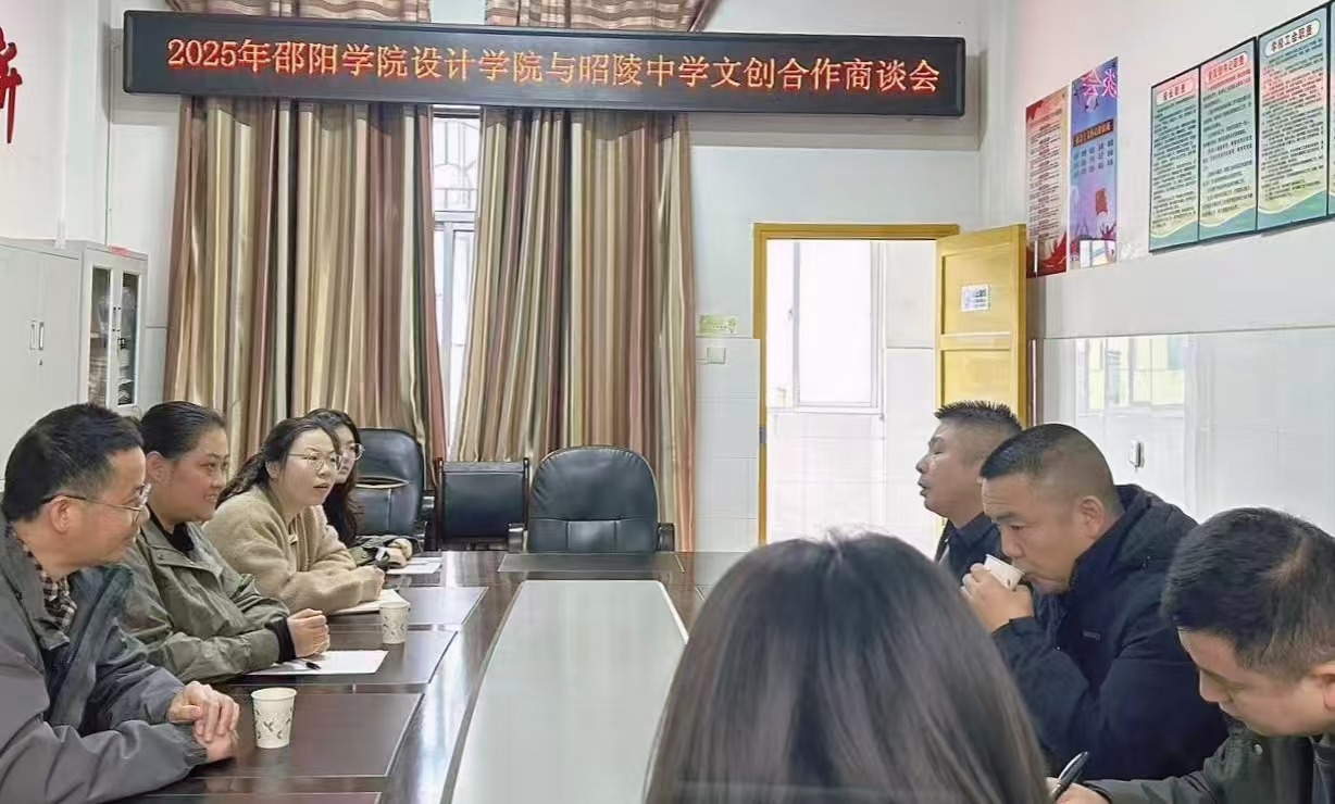 11月4日,邵阳学院设计艺术学院副院长韩磊、美术学专业彭晓智老师及学生团队赴昭陵中学开展文创设计合作洽谈活动。昭陵中学校长罗文锋和副校长陈最祥、杨梅红等校领导热情接待,双方就校园文化提质改造项目展开专题研讨并深入交流。