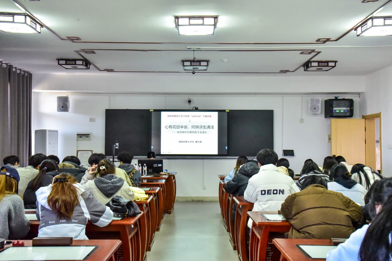 讲座中,唐月春老师以《锤心有花田半亩,何惧浮生清浅——谈谈新时代教师的专业成长》为题,结合自身数十年从教经历,生动分享了从青年教师成长为正高级教师的职业历程与心路感悟,着重强调了对教育事业的热爱与坚守是教师职业发展的核心动力,鼓励在场美术师范生要树立终身学习理念,持续精进专业技能,不断提升自身专业素养与教学实践能力。同时,针对中学美术课堂教学实际,唐老师围绕教学设计、课堂互动、评价方式等关键环节,分享了一系列实用教学方法与创新思路,通过具体教学案例剖析,为学子们未来走上教学岗位提供了可借鉴的实践经验。