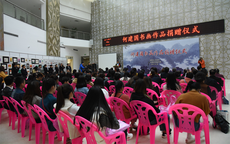 捐赠会上,何建国老师深情地说:“家乡的水,家乡的人,过去留在我的图画中,留在我的诗吟中;此刻,印在我的眼里,留在我的生命里。我把我的一些作品永远地留给家乡,留给人民。”他寄语艺术设计学院广大学子:“艺术是为了人民,属于人民。”