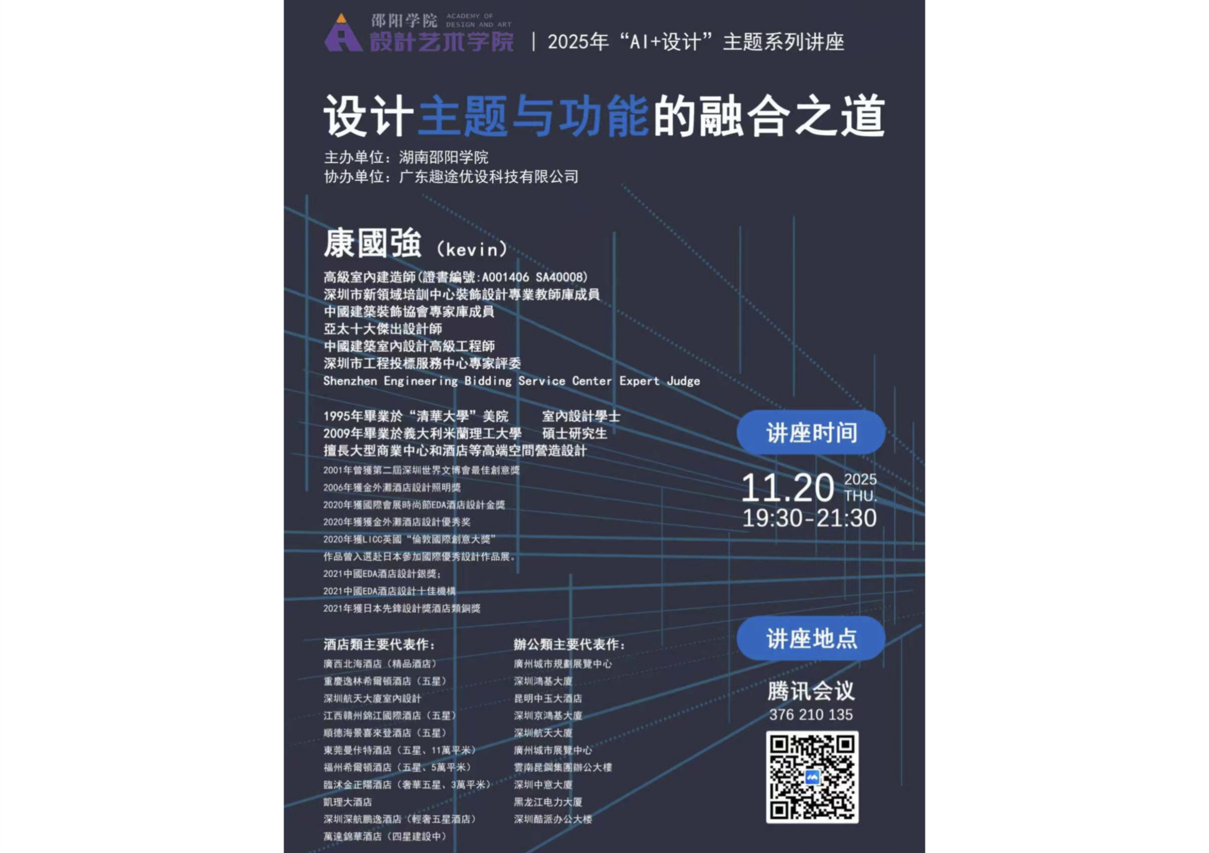 11月19日19时30分,我院2025年“AI+”主题系列第八场讲座顺利举行。本次讲座以“设计主题与功能的融合之道”为主题,特邀高级室内建造师、中国建筑室内设计高级工程师、亚太十大杰出设计师、中国建筑装饰协会专家库成员、深圳市新领域培训中心装饰设计专业教师库成员、深圳市工程投标服务中心专家评委康国强老师,通过线上会议方式进行专业分享。