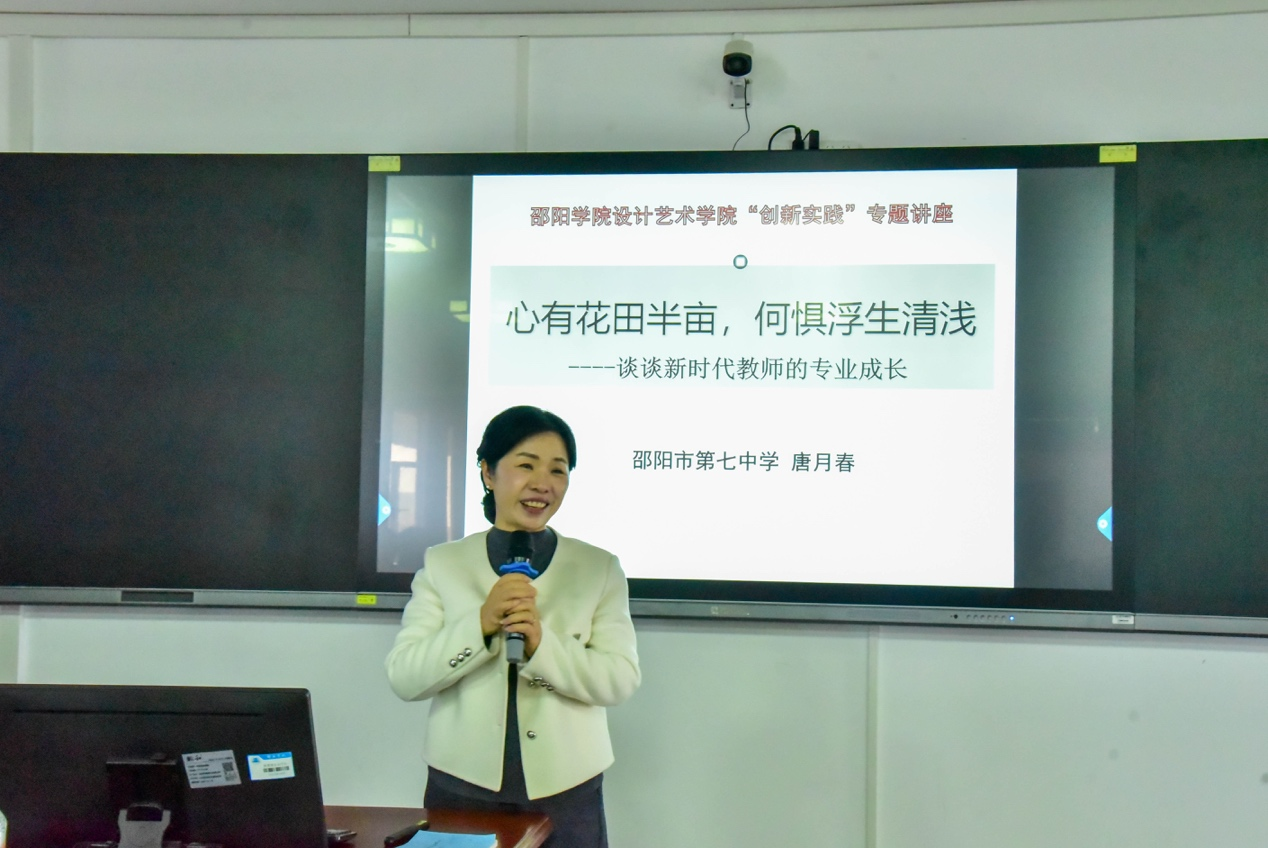 11月28日下午,设计艺术学院在明德楼北楼1009教室成功举办“深耕地方、融合创新,赋能师范生成长——中学美术教育创新实践”专题系列讲座03。本次讲座特邀邵阳第七中学正高级语文教师唐月春为主讲人,我院美术学专业教师覃振华、王明清、苏丹及该专业全体学子共同参与。