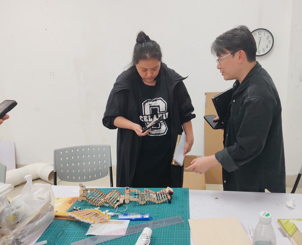 座谈会后,在刘再行副院长的陪同下,调研组一行参观了湾区创新学院的教学设施和学生作品展示区。参观过程中,刘再行副院长详细介绍了代表性设计作品及其在教学实践中的应用价值。