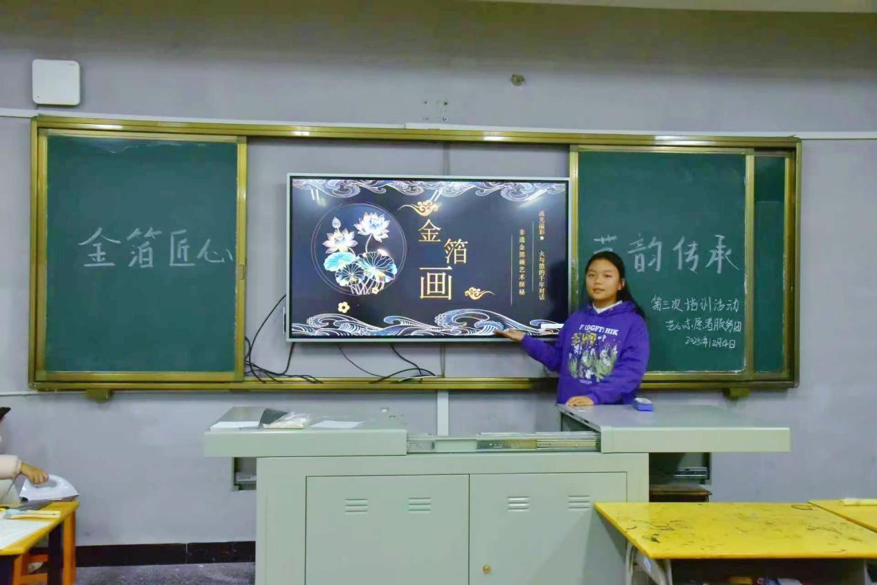 (图为青年志愿者实践部部长陈思奕讲解金箔画创作过程)