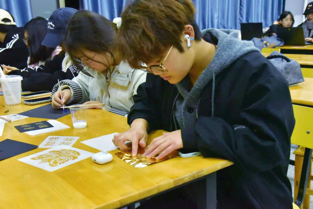 活动中,陈思奕以精练幽默的风格,先介绍了金箔画的发展历程、艺术风格及实际应用场景,再配合视频资料拆解制作过程,现场展示金箔画核心工具并完整演示制作流程。之后,她为每位同学分发材料,指导大家亲手创作金箔画,沉浸式感受传统艺术的魅力。过程中,她及时为遇到制作困难的同学提供指导帮助,现场氛围轻松活跃,同学们全身心投入创作。活动最后,大家纷纷展示自己的成品,交流创作思路与心得,在互动中进一步深化了对传统工艺的理解。
