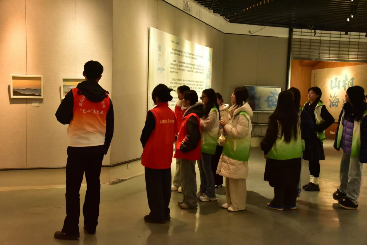 本次画展由设计艺术学院团总支主办,校学生会青年志愿者实践部等多部门联合承办,延续了“山海相逢”写生画展的艺术脉络。活动特别安排专业讲解员与参展学生担任引导员,将参观队伍分为四组,分别沿“山之骨”“海之韵”“笔墨相逢”三条特色路线参观。讲解员们细致解读油画的色彩层次、水彩的水色交融与国画的笔墨意境,让非艺术专业的学生代表们深入感受山海意象中的自然之美与人文底蕴。