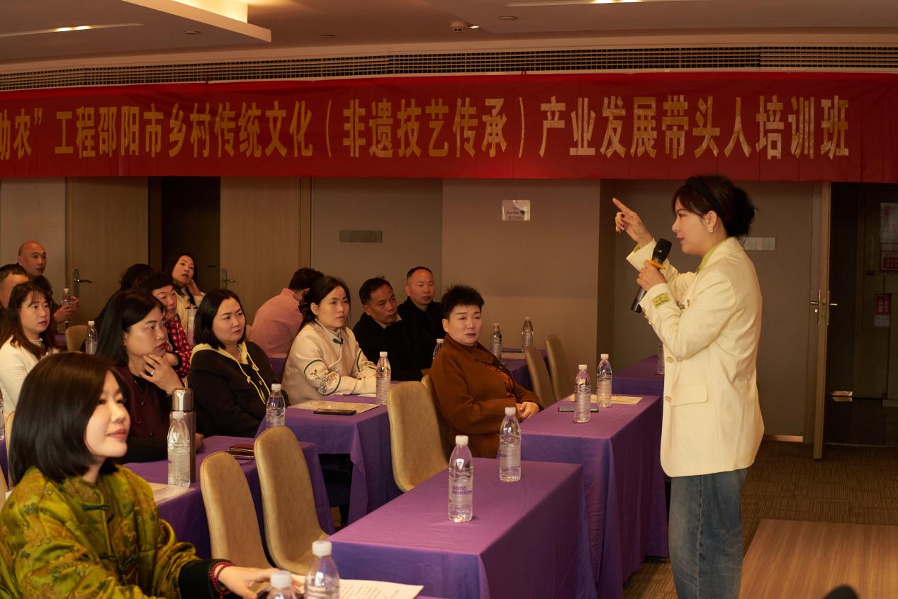 培训中,李韧副教授围绕“非遗的现代转型”与“非遗电商破局”两大核心议题进行了长达四小时的深度讲授。在“非遗的现代转型:从技艺传承到价值共创的品牌生态系统构建”板块,她结合我校设立的邵阳红品牌研究院以及设计团队近年来深度参与的李子塘村、台上村、南岗小镇等美丽乡村建设案例,剖析了非遗品牌化的底层逻辑以及非遗+的各项潜能,目的在于聚焦品牌,赋能价值。李韧指出,非遗不应止步于技艺展示,而应通过挖掘文化基因,构建“红色铸魂、产业富民、文旅赋能”的生态体系。她向学员介绍了我校团队通过IP形象设计、品牌符号构建及文旅线路规划,将传统技艺转化为品牌资产,实现从“单向传承”到“价值共创”跨越的实践经验,并强调了为文化出海做好品牌储备的前瞻性思路。