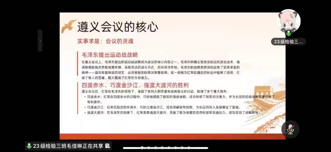 会议第二项为“微党课”分享环节。23级检验四班余溢同志以《新时代大学生的责任与担当——学习二十届中央纪委五次全会精神心得体会》为主题进行分享。他生动阐释了全会精神对青年学子的深刻启示,并提出了“主动学习、心怀大局、勤于反思、严守规矩”的清晰行动指南。紧接着,23级检验三班的毛佳琳同志以《弘扬遵义会议精神,践行实事求是》为主题进行分享。她深刻剖析了“实事求是”作为会议灵魂的深刻内涵,探讨了如何在思想、学习与生活中践行“实事求是”精神,号召大家继承党的宝贵精神财富,在本职岗位上踏实进取、勇于担当。