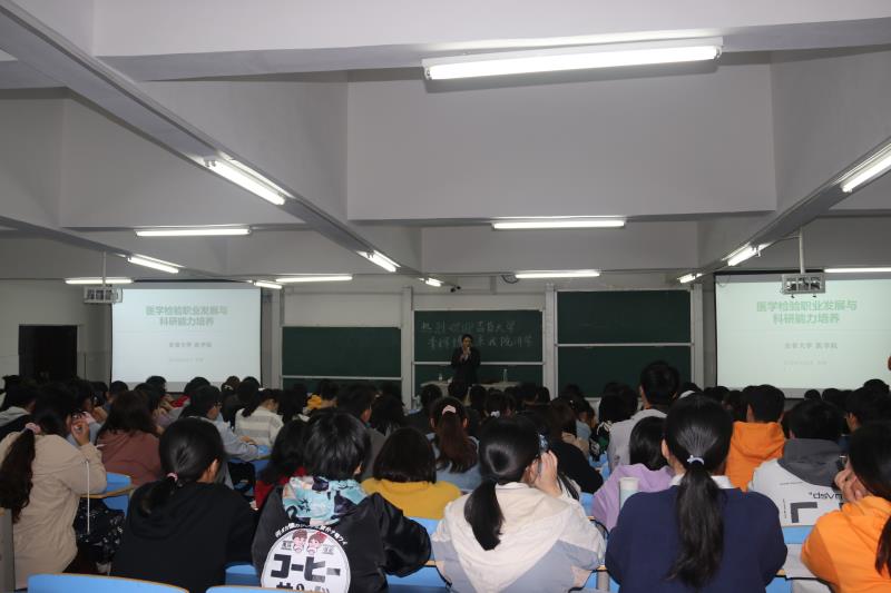 这四类就业方向中对人才要求的共同点是科研思维能力,李辉博士就怎样培养科研思维能力作了详细的解说,要求同学们掌握学习的主动权,不仅要有求同思维、顺向思维,更为重要的要有求异思维、逆向思维、标新立异。在讲座中他还多次讲到了学好英语、专业知识,报考医学检验专业研究生的优点,希望每个医学检验学子为了自己美好的人生都要认真考虑、规划。最后,李辉博士借用比尔盖茨的一句话结束讲座,未来的世界首富一定出现在“医学检验领域”!