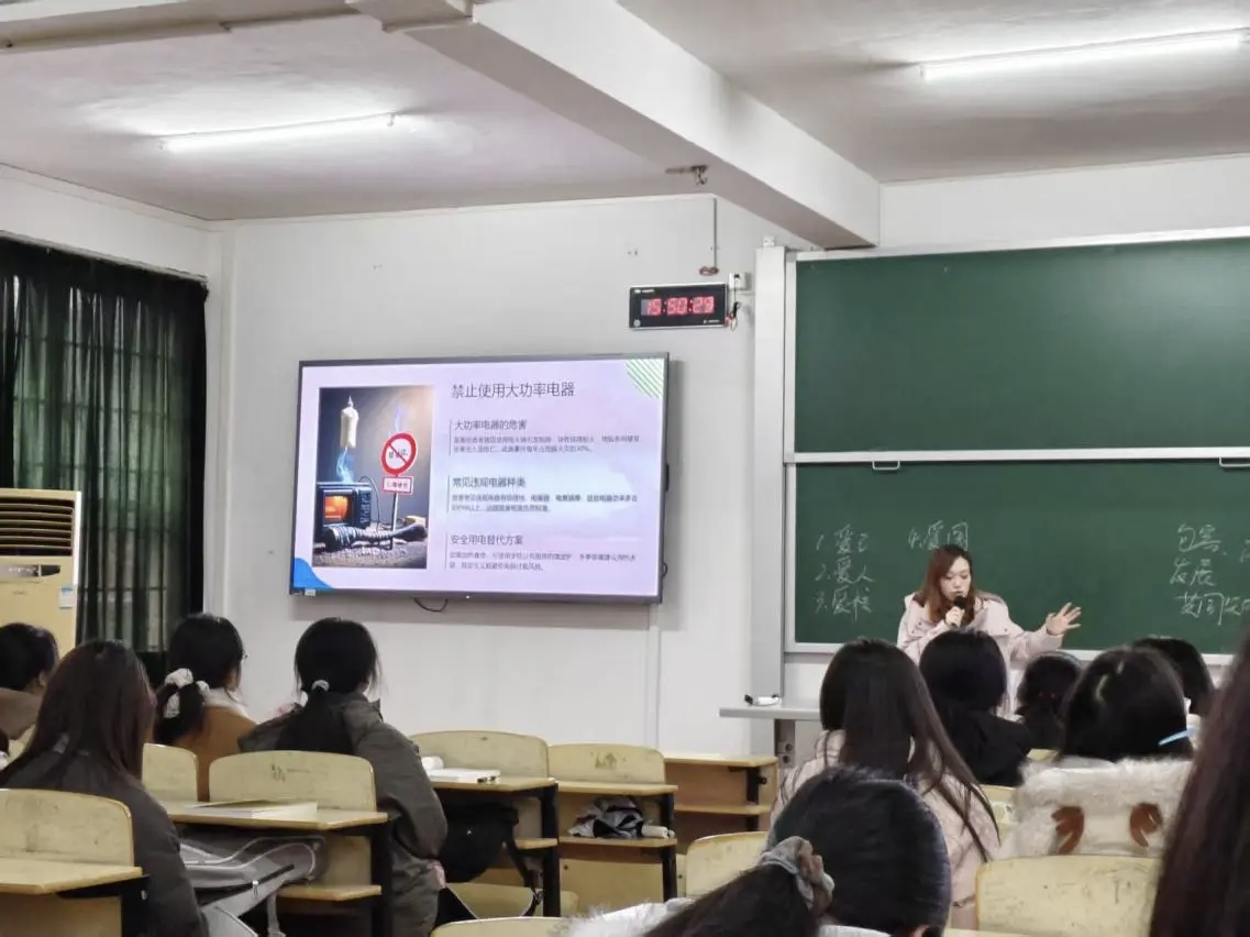 用电安全板块直击宿舍管理关键。辅导员和班主任结合学院宿舍安全管理规定,明确严禁使用大功率电器、私拉乱接电线等违规行为,详细讲解违规用电引发火灾的危害与后果。要求各年级学生认真排查自身及宿舍周边的用电隐患,做到规范用电、安全住宿,从源头杜绝安全事故发生。