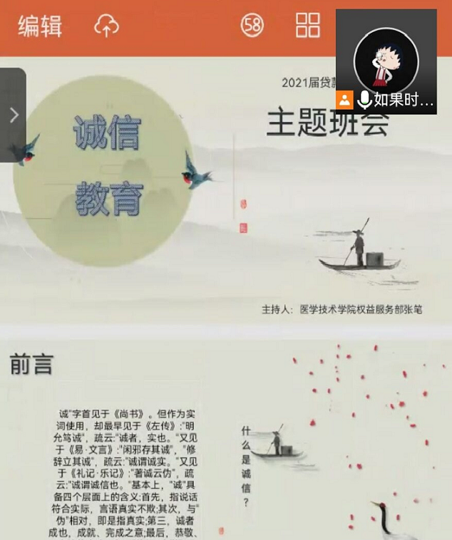 2021年5月21日19:00,开展了以“诚信贷款”为主题的班会,面向17届毕业生,旨在提高诚信普及以及诚信重要性的认知,加强校园诚信建设。班会上,主讲人首先从增强对他人、对社会的职责感,树立正确的为人处世态度和守信为荣、失信可耻的道德观念,大力弘扬中华诚实守信美德方面说起,提出诚信待人、诚信做事、诚信学习、诚信贷款、诚信立身的重要性。随后,主讲人向学生讲明还款责任,增强贷款学生的诚实守信意识。提倡勤奋好学,反对惰性厌学;提倡诚实守信,反对作弊舞弊;提倡真才实学,反对弄虚作假;提倡严谨自律,反对自由散漫。最后,教育学生去当地相关部门办理生源地贷款时做好自我防护,戴好口罩,勤洗手,勤消毒。