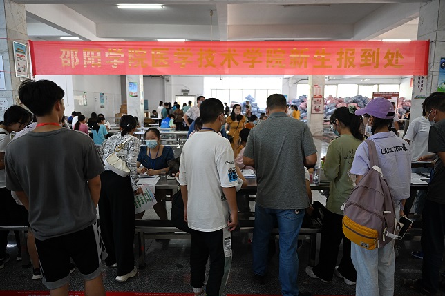 按照新冠疫情防控要求,志愿者们指引学生和家长有序进行报到,他们为新生测量体温、做好登记、搬运行李,解答新生及家长的各种疑问,忙得不亦乐乎。