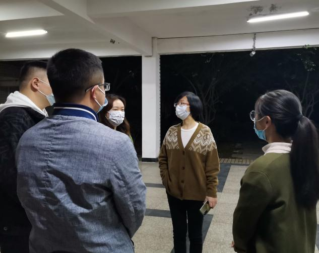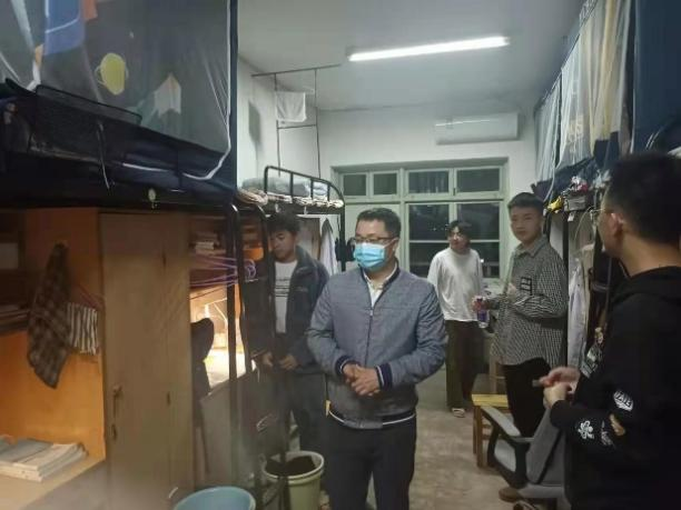 2022年4月4日晚上10点,学院党总支副书记刘婕带领各年级辅导员钟婧、刘漫雪、赵艺、贺晓洁和班主任谭依东老师对学生宿舍进行晚点名,检查学生晚归情况,同时加强学生疫情防控教育,并叮嘱学生遵守学校疫情防控有关规定,严禁私自出校,保持宿舍环境整洁,做好开窗通风,戴好口罩,不聚集。